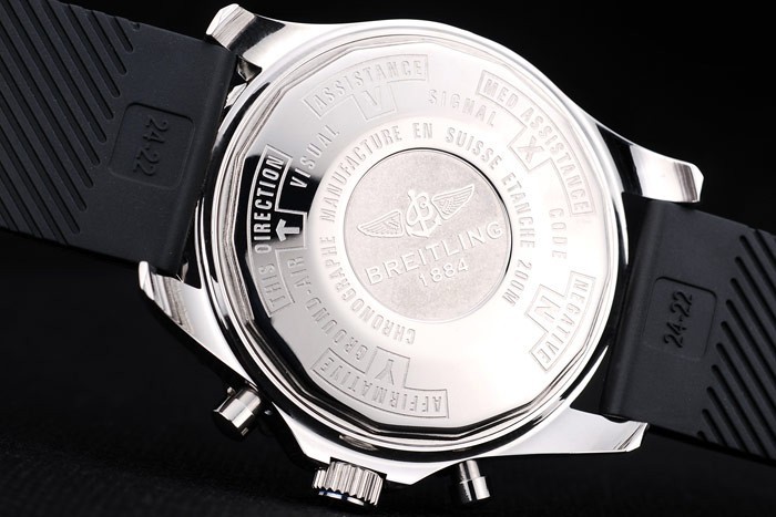 Bracelet: Black rubber strap with Breitling logo engraved stainless steel hook-buckle clasp