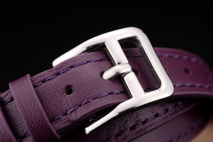 Bracelet: Elongated purple leather strap with heat embossed Bracelet Hermes stamp and Hermes engraved polished stainless steel hook-buckle clasp