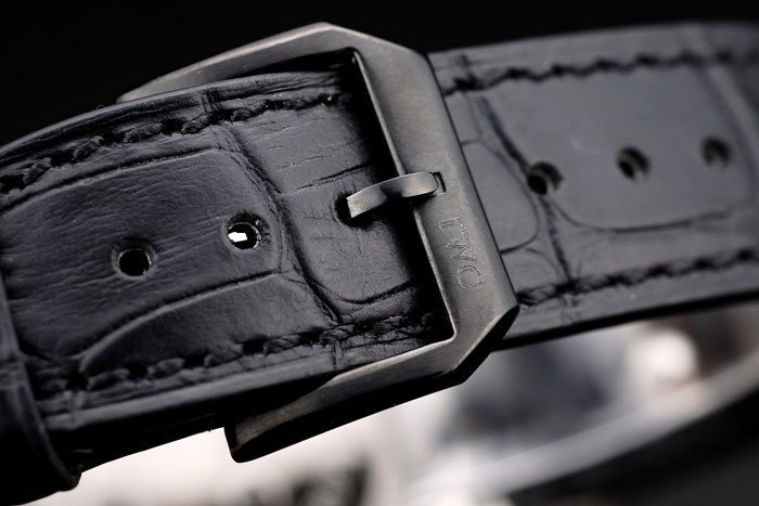 Bracelet: IWC heat embossed black crocodile leather strap with IWC engraved ion-plated stainless steel hook-buckle clasp
