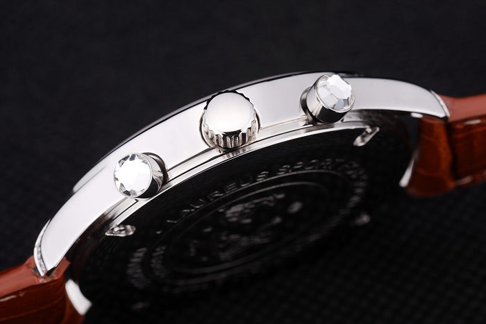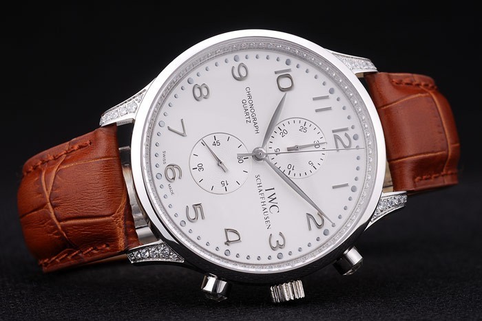 Crown: Polished stainless steel cutwork crown with IWC logo engraving and two smaller round push-button crowns on either side of it