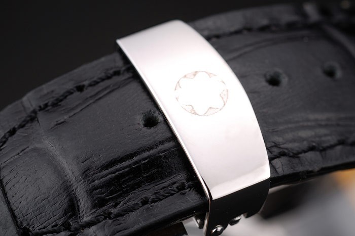 Bracelet: MontBlanc heat embossed black crocodile leather strap with MontBlanc logo inscribed polished stainless steel hidden hook clasp
