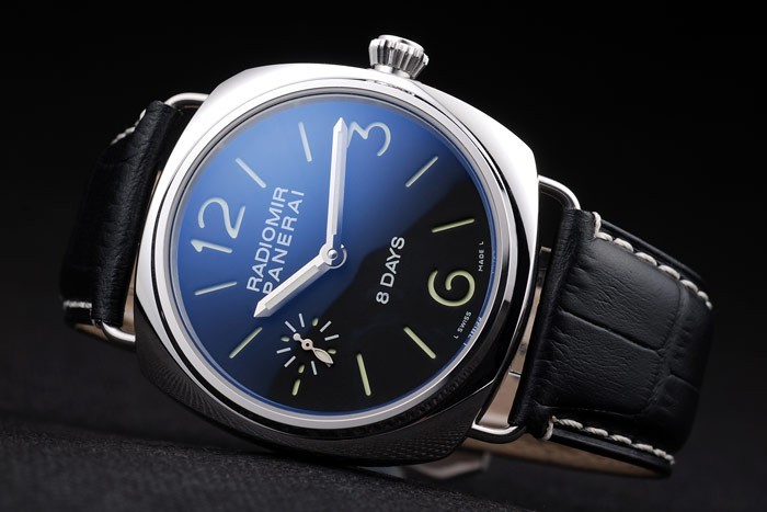 Bracelet: Black crocodile leather strap with white stitching and heat embossed Officine Panerai Italy stamp and brushed stainless steel hook-buckle clasp with Panerai engraving