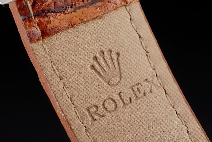 Bracelet: Rolex heat embossed brown crocodile leather strap with engraved stainless steel deployment clasp with Rolex logo on top
