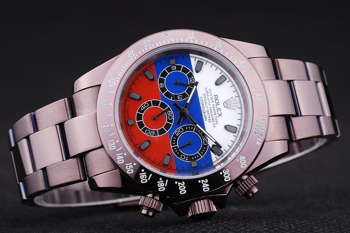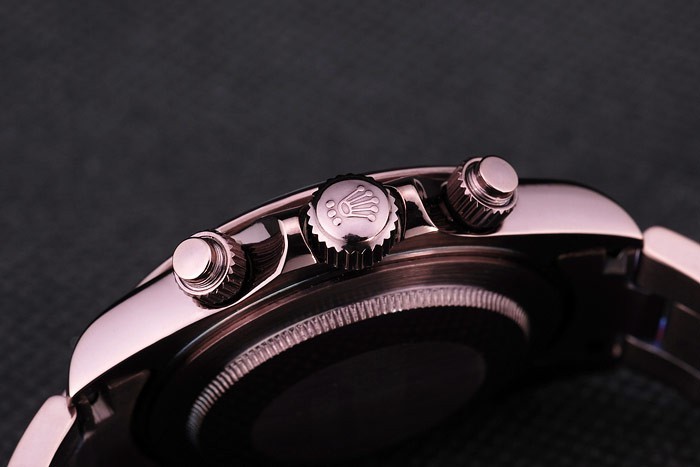Crown: Rosy brown stainless steel cutwork crown with Rolex logo and two smaller push-button cutwork crowns on either side of it