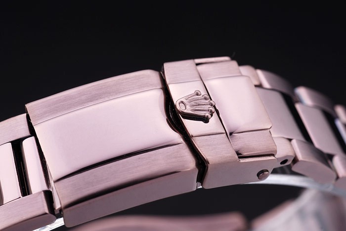 Back: Rosy brown powder coated brushed stainless steel snap-in back with Rolex inscription