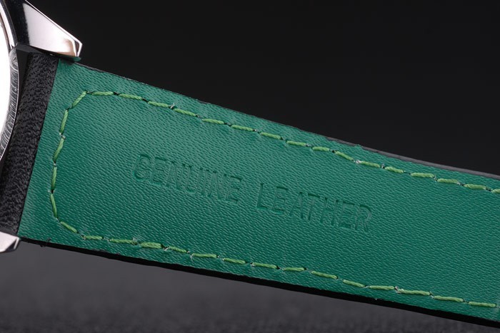 Bracelet: Heat embossed Tag Heuer black leather strap with green stitching and stainless steel fold-in clasp with push release feature