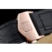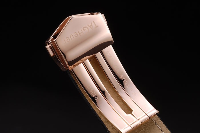 Bracelet: Heat embossed Tag Heuer black crocodile leather strap with rose-gold push-release fold over clasp with Tag Heuer logo on top