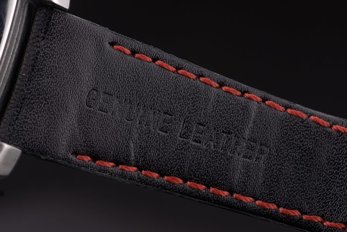 Bracelet: Heat embossed Tag Heuer black perforated leather strap with red stitching in the inside and stainless steel fold-in clasp with push release feature